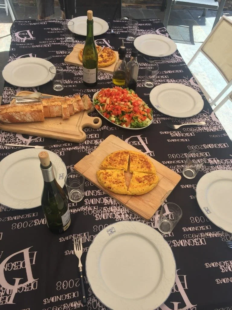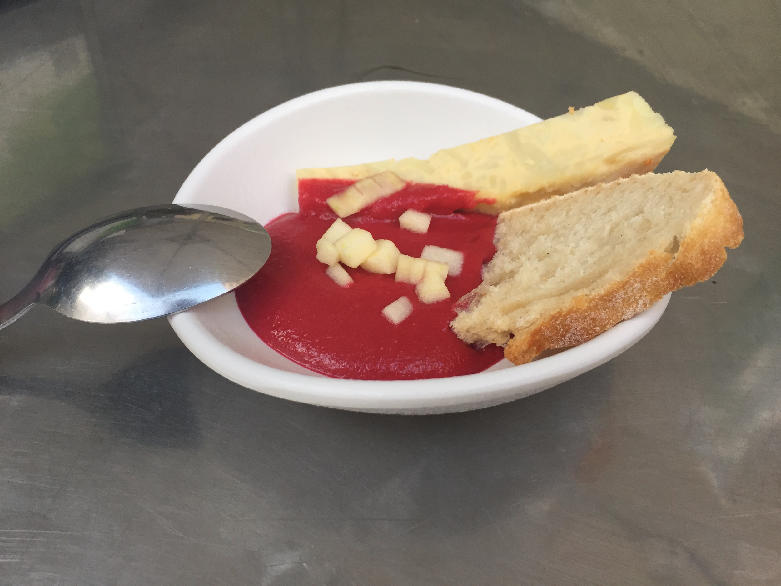 A tapa of salmorejo with a slice of tortilla and a slice of bread. Salmorejo is a tomato soup served cold, like gazpacho, but its other ingredients are bread, olive oil, and garlic, whereas gazpacho includes green peppers, cucumbers, garlic, vinegar, and olive oil. This salmorejo also included a bit of red beets, which gave it this vibrant pink-red color. Tortilla, in Spain, refers to an egg and potato dish that can be served warm or at room temperature.